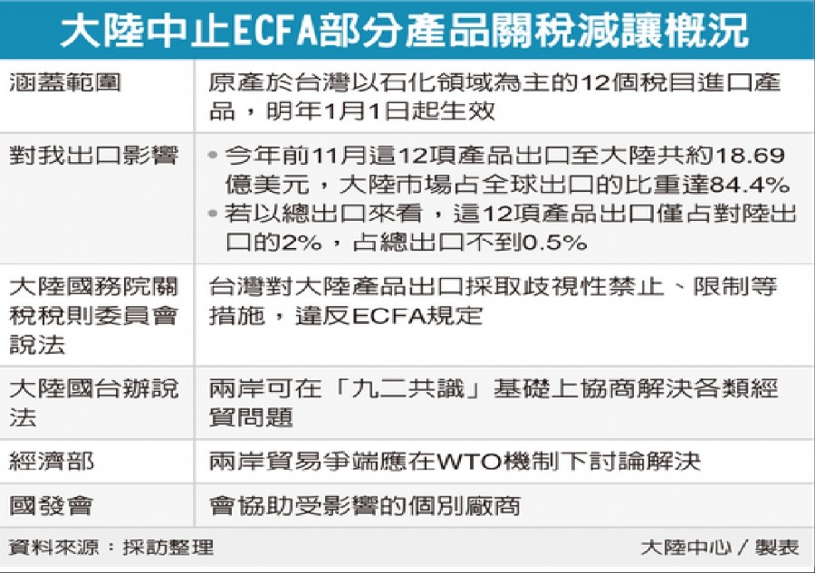大陸對台貿易壁壘調查結果出爐後,昨(21)日進一步公告自明年1月1日起,中止《海峽兩岸經濟合作架構協議》(ECFA)部分產品關稅減讓,範圍涵蓋原產於台灣以石化領域為主的12個稅目進口產品。大陸國台辦表示,兩岸可在「九二共識」基礎上協商解決各類經貿問題。